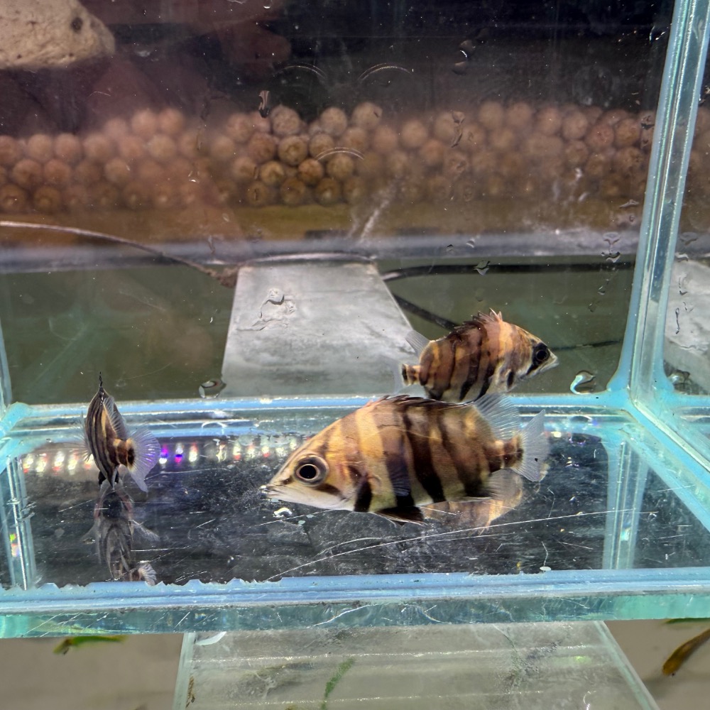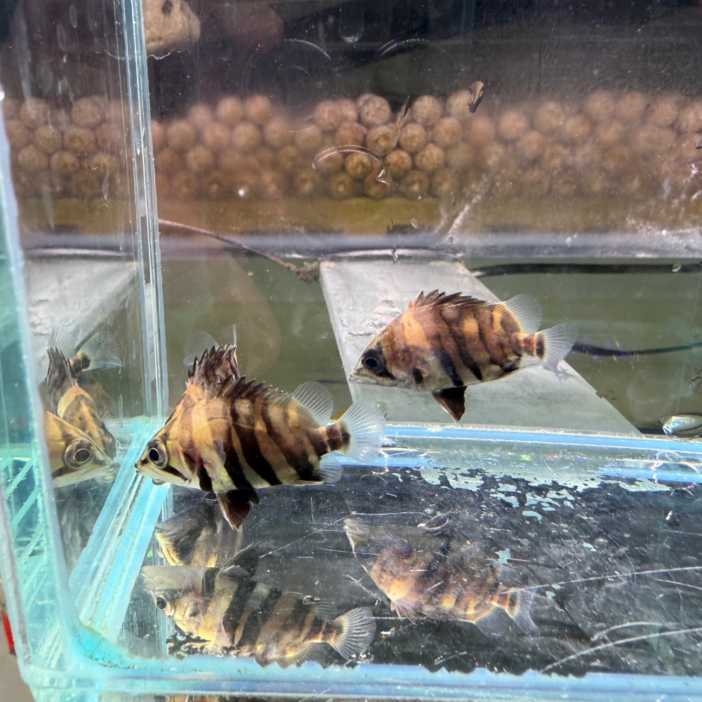 加里曼丹四線虎是虎魚品系中稀有且高辨識度的代表,體色以金黃至淡金色為底,搭配四條深色粗壯虎紋,呈現完美對比。身形厚實結實,尾鰭與身體比例協調,游姿沉穩而不失靈動。成魚可達 30–35 公分,性情穩定、觀賞性高,是虎魚玩家眼中不可錯過的珍貴品系。