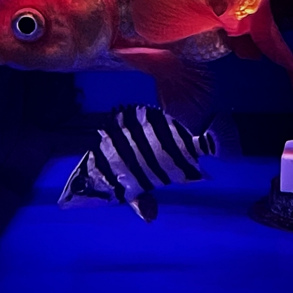 寬厚垂直黑帶與金銅底色聞名。體態厚實、頭型有力,靜止時如虎蹲伏,游動時黑帶與金底形成強烈節奏感。隨成長條紋愈發清晰,是虎魚中辨識度與氣場兼具的代表型。