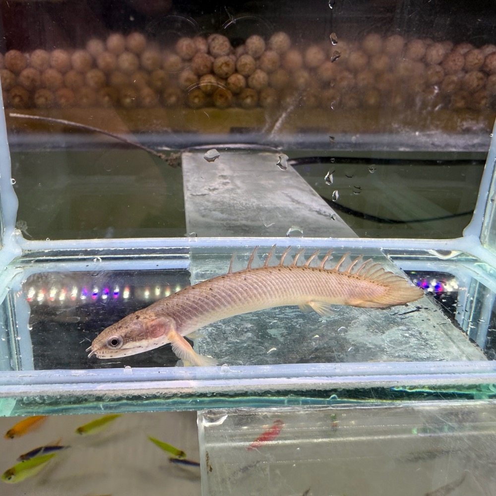 金恐龍屬於恐龍魚中最具代表性的物種之一,體型呈長筒狀,背鰭分節排列,展現典型原始魚類的進化特徵。體色由淡金至金黃色調,隨光線變化散發柔和光澤。牠們多在缸底活動,行為沉穩、適應力強,對環境容錯率高,是兼具觀賞性與入門友善度的經典恐龍魚品種。