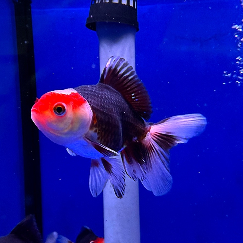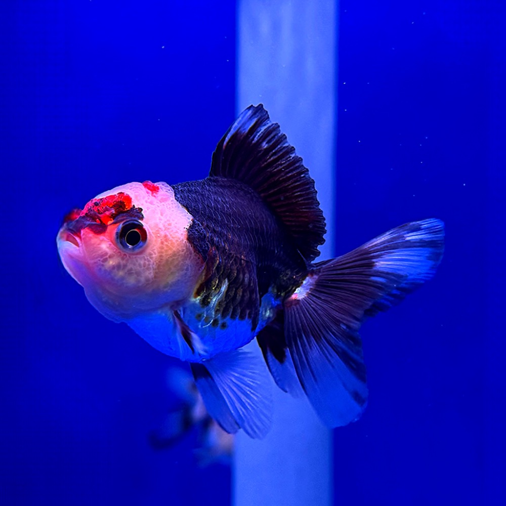 三色瑪麗泰獅,金魚中最具華麗氣勢的代表之一。牠以「紅、白、黑」三色相間的斑紋著稱,如同精雕細琢的水中錦繡。渾圓的身形搭配飽滿的頭瘤與高舉的背鰭,游姿穩重優雅,散發出王者般的從容氣度。