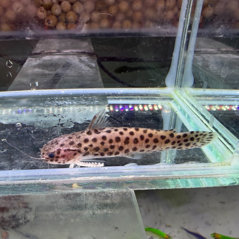 大豹鯨原生於祕魯亞馬遜支流,體側佈滿不規則深色豹點與木紋底色,與沉木、落葉環境高度融合。頭型寬厚、觸鬚修長,白天多半躲藏於陰影下,入夜後開始活動覓食。貼底緩行的姿態沉穩有力,是極具氛圍感與觀察樂趣的特色貓魚。