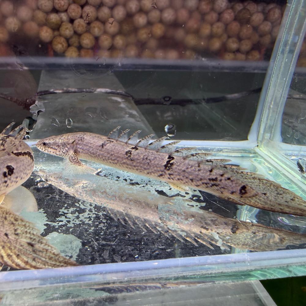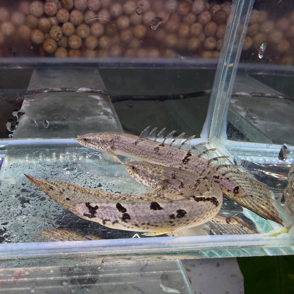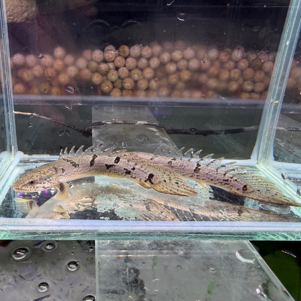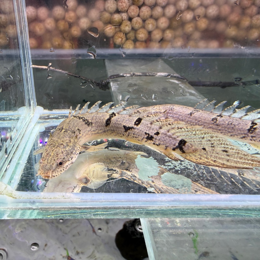斑節恐龍原生於中非剛果河系,是恐龍魚中以整齊垂直帶紋聞名的代表種。全身覆蓋厚實菱形鱗片,背部一節節獨立小背鰭如旗幟排列;貼底緩行、動作沉穩,呼吸時偶爾上浮換氣,原始氣息濃厚,觀察張力十足。
