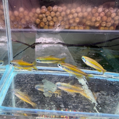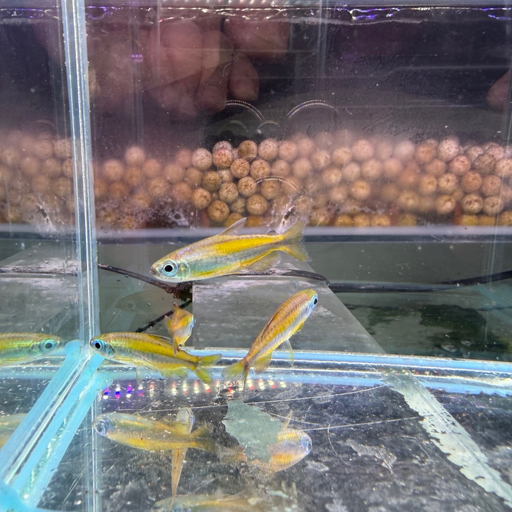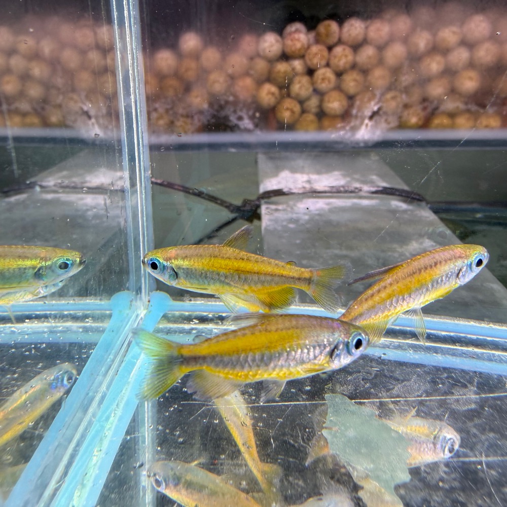 黃金二線剛果為非洲剛果燈科魚種之一,以溫潤金黃色體色與體側兩條明顯光帶聞名。體型修長、鰭條延展,游動時呈現柔順而富層次的動態效果。群游時整體光澤流動,極具觀賞價值。