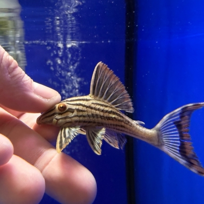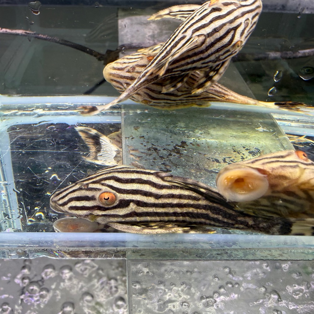 白金皇冠豹為皇冠豹異形的高表現型之一,以高對比白金條紋覆蓋全身,紋路粗獷有力。體型厚重、頭部寬大,搭配異形特有的吸附口與啃木習性,展現強烈的原生風格與存在感,是大型異形中的經典代表。
