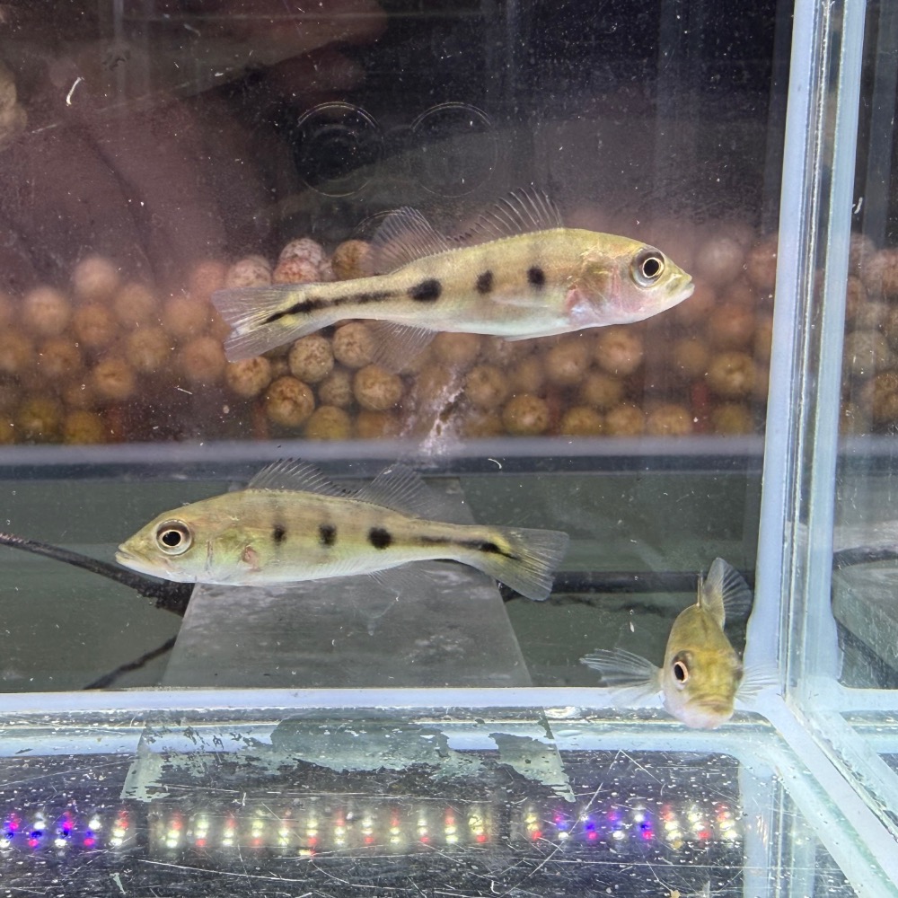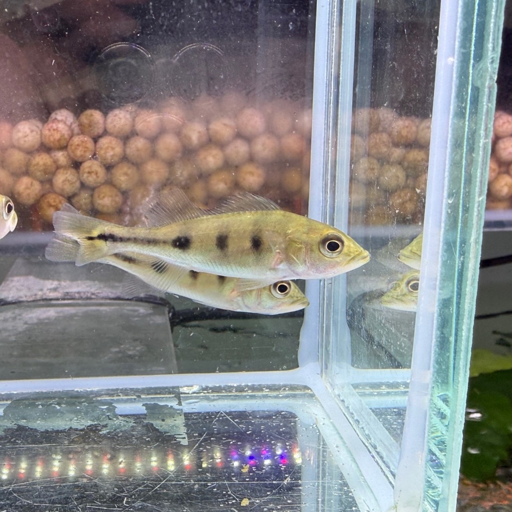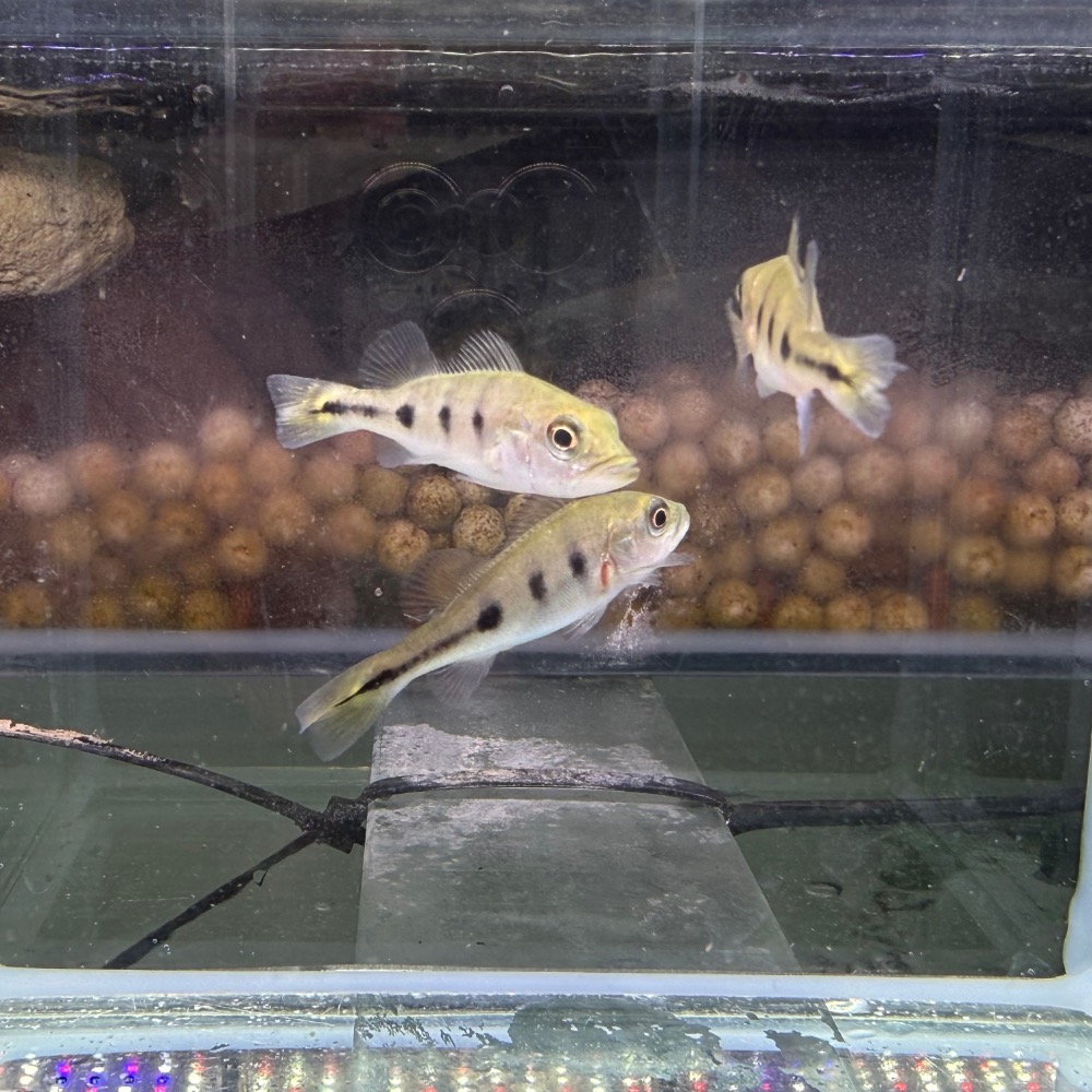 巴西亞金三間為孔雀鱸中極具代表性的品系之一,以金黃色體表搭配三條黑色垂直條紋聞名。體型修長結實,游速極快,具強烈掠食本能。成體氣勢壓場,是大型掠食魚中兼具速度與觀賞性的經典選擇。